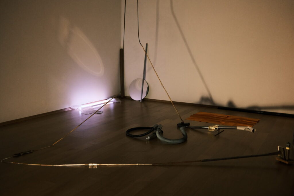 Within the Grey Room Studio, fixed interconnected objects amount to a situation composed of items made of diverse materials – once discarded, now objects trouvés. Through changes in lightening, sound, and movement, the visitors are challenged to explore the installation.